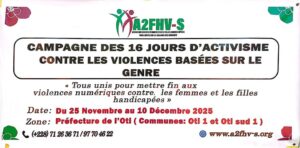 CITOYENNE Le mardi 25 novembre 2025 s’est tenu dans les locaux des affaires sociales de la commune de l’Oti Sud 1 (Gando) le lancement officiel de la campagne des 16 jours d’activisme contre les violences faites aux femmes et aux filles. Cette campagne, est organisée par l’Association des femmes et filles handicapées vaillantes des savanes (A2FHV-S), avec l’appui financier de la coopération allemande GIZ.