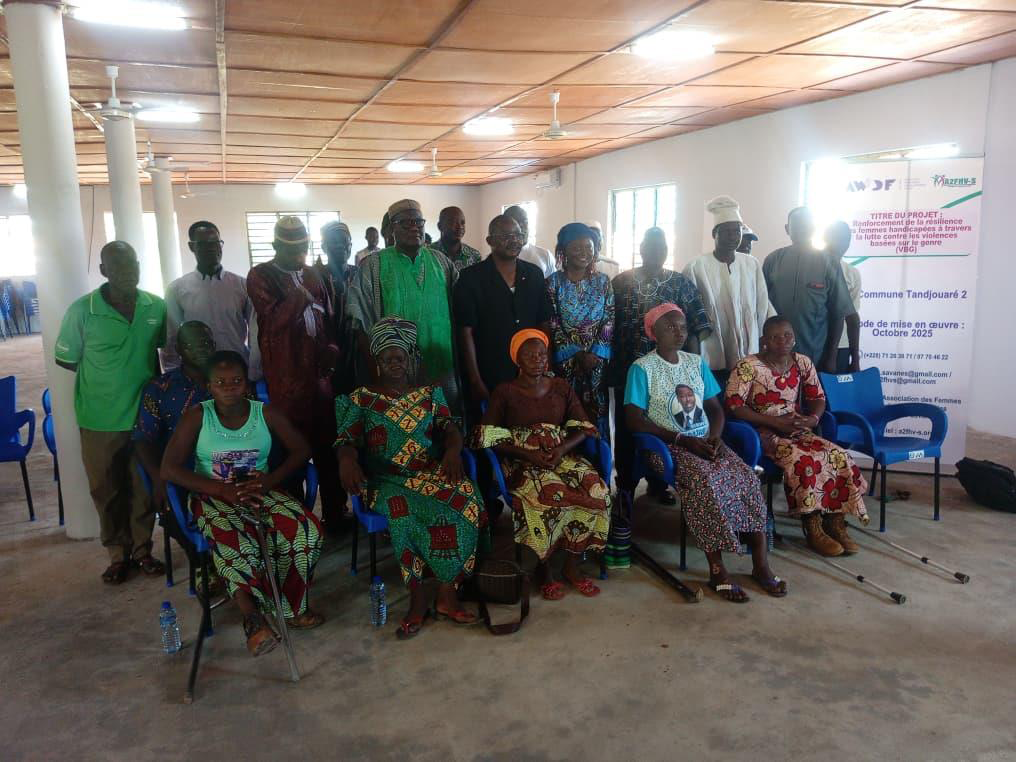 Face à cette réalité, l’Association des Femmes Handicapées Vaillantes de la région des Savanes (A2FHV-S), avec l’appui de ses partenaires locaux et techniques, a initié le projet “Renforcement de la résilience des femmes handicapées à travers la lutte contre les VBG”. Ce projet est mis en oeuvre dans la commune de Tandjouaré 2 avec l’appui financier de African Women’s Developpement Fund (AWDF). Le projet vise à promouvoir les droits, la protection et l’autonomisation des femmes handicapées, tout en impliquant activement les autorités locales, les leaders communautaires et les organisations de la commune de Tandjoaré 2.